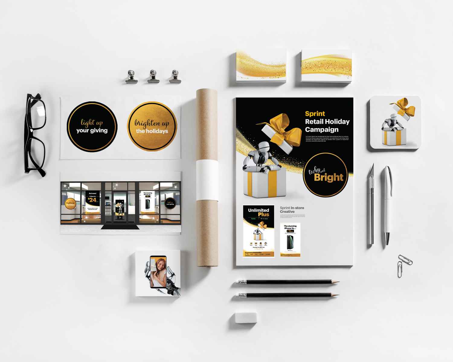 Chosen toolkit for 2018 Sprint Holiday thematic. implemented through retail, above the line tactics, social media, and web. Credit: Kirsten Overby Design Partner